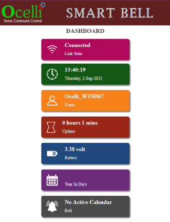 Info section displays the WIFI status, Current date and time, Name (SSID) of the device, Uptime since the last power up, Real Time Clock time, battery voltage, The duration of the programmed calendar (the number of days in the year that the program covers) and the time at which the next bell will ring in a given day unless it is an holiday in which case it shows as a holiday. These settings are updated once every 30 seconds. Date and time may not be correct when the device is powered up for the first time but will reflect the correct value after the first setup procedure. Date and Time is automatically updated whenever any settings of the device are changed. That means, there is no user action is needed to update the date or the time and these get updated along with other settings based on the phone or Tabs date and time without need for any user action.